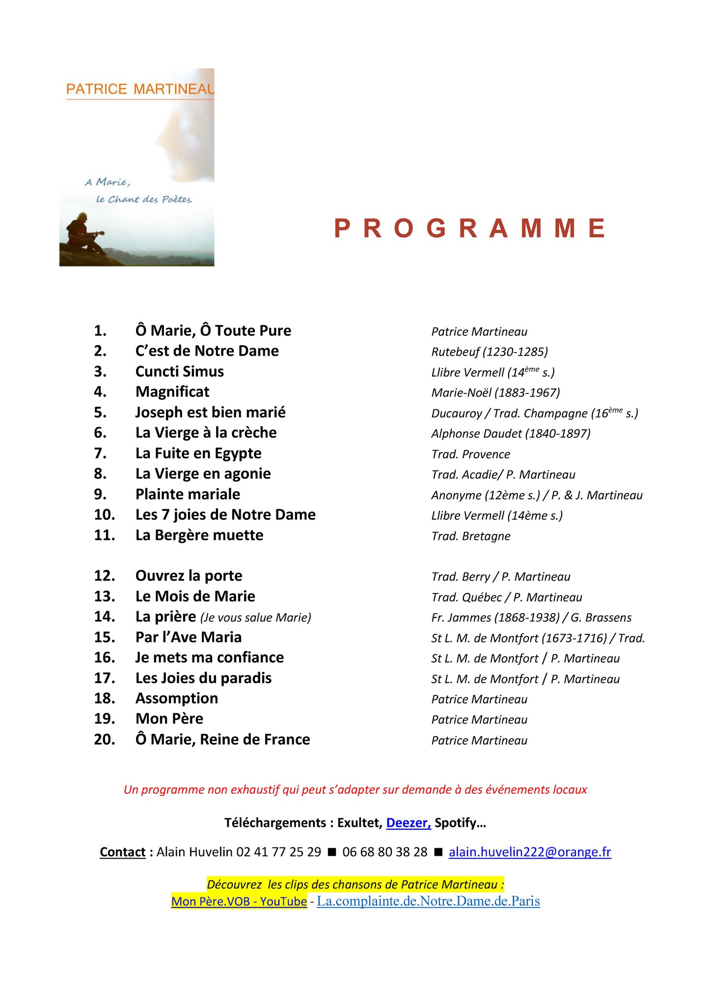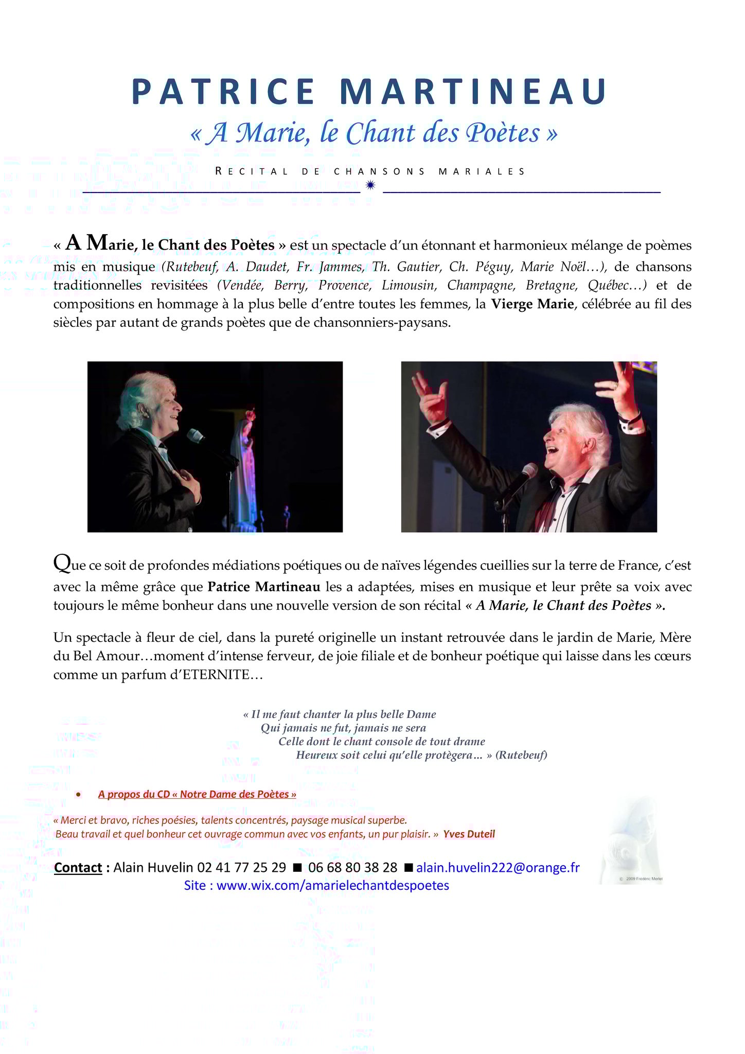 Que ce soit de profondes médiations poétiques ou de naïves légendes cueillies sur la terre de France, c’est avec la même grâce que Patrice Martineau les a adaptées, mises en musique et leur prête sa voix avec toujours le même bonheur dans une nouvelle version de son récital « A Marie, le Chant des Poètes ».