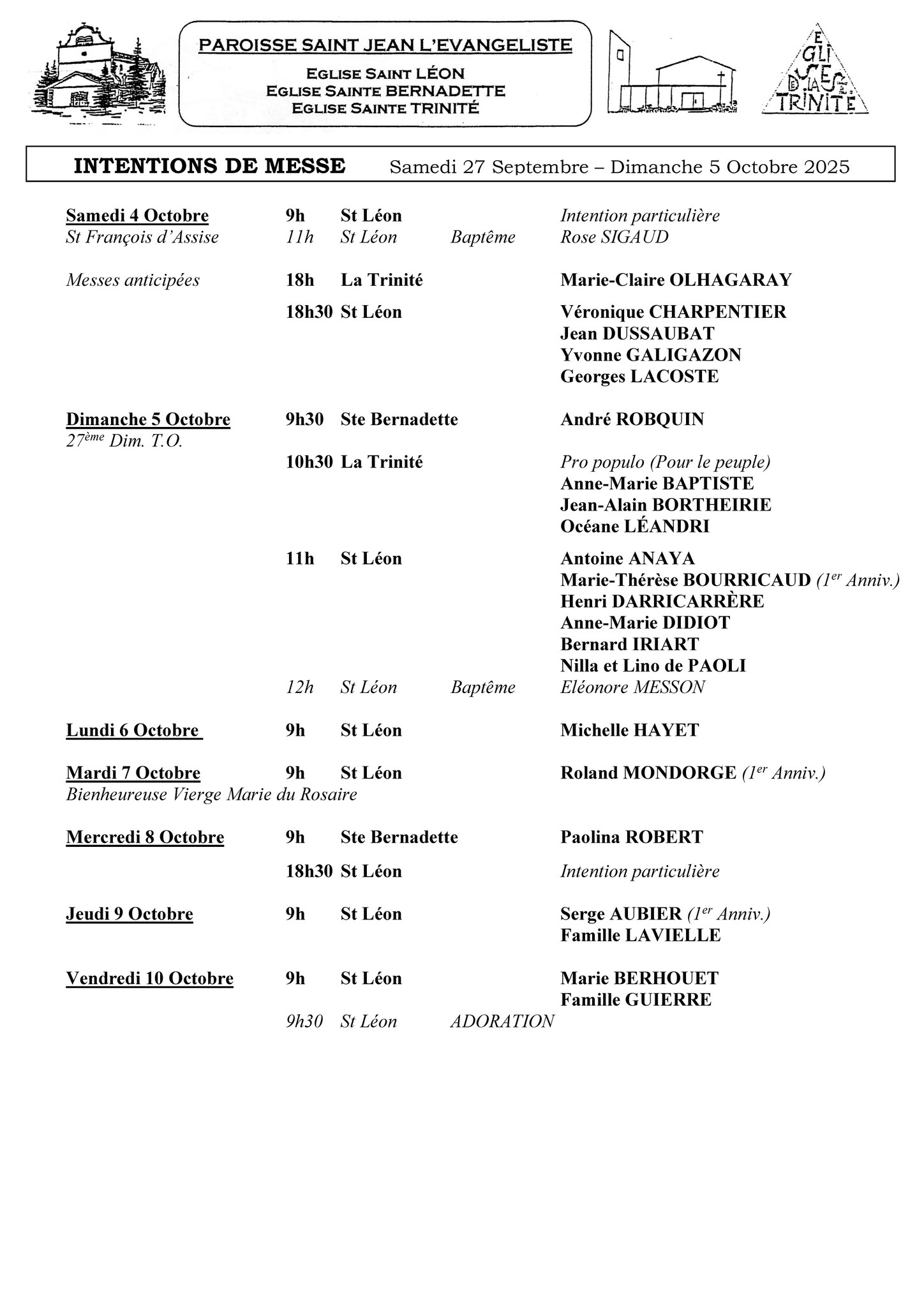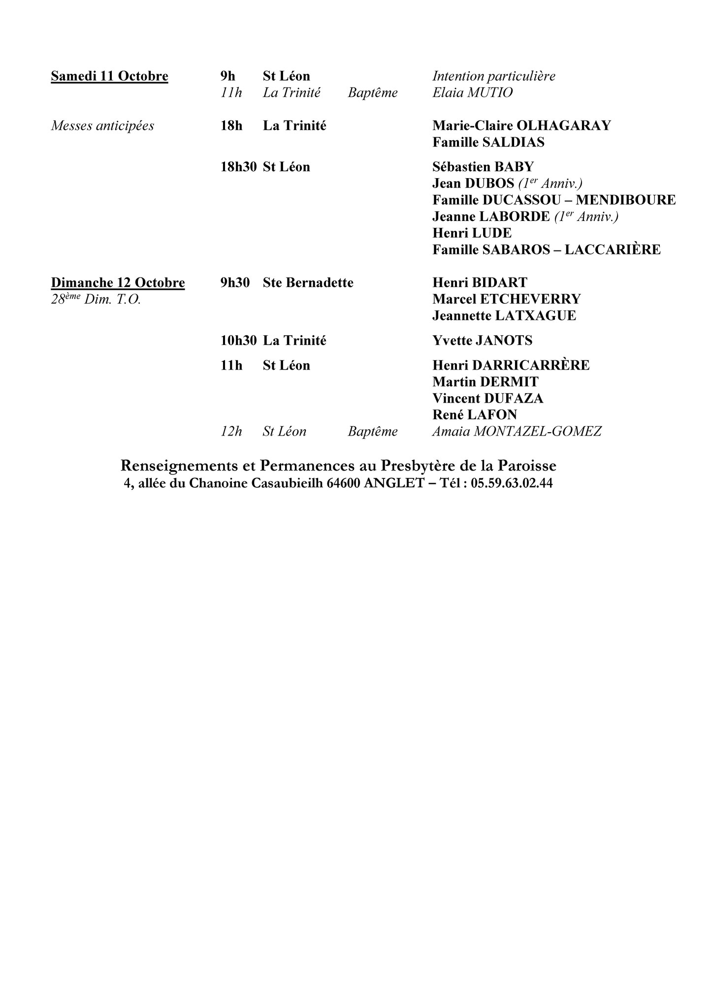 Si vous désirez faire célébrer des Messes à Sainte-Bernadette, à Saint-Léon ou à la Sainte-Trinité, vous pouvez joindre le secrétariat paroissial, où une permanence téléphonique (Tél. 05 59 63 02 44) est assurée le vendredi matin de 9h30 à 12h.